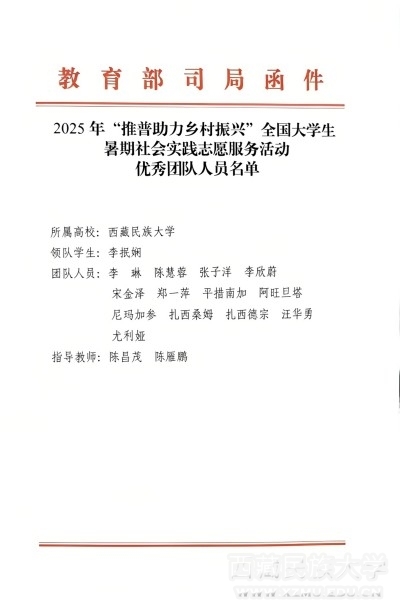 教育部、团中央在表扬信中充分肯定了学校实践团的服务成效与青年担当。今后,学校将持续贯彻落实习近平总书记关于推广国家通用语言文字的重要指示精神,发挥法学专业特长,深化“推普+普法”实践模式,借助数字化手段开展“普通话—藏语”双语法治服务,建立健全可复制、可持续的长效机制,为西藏乡村振兴与法治建设贡献青春智慧与力量。