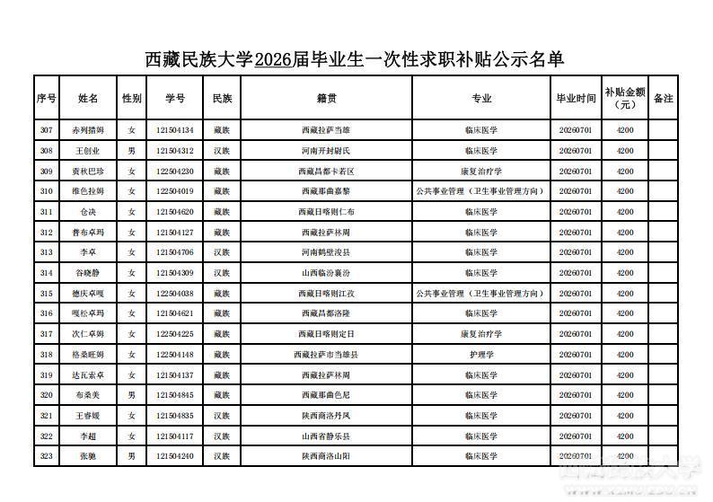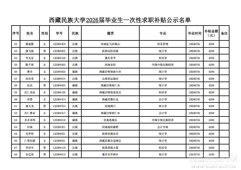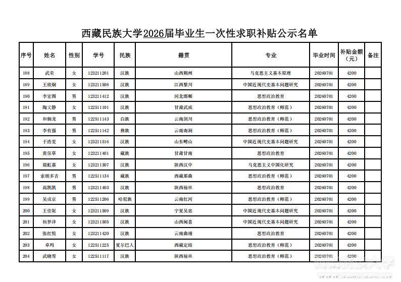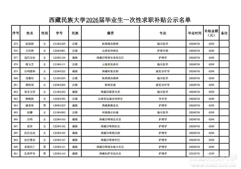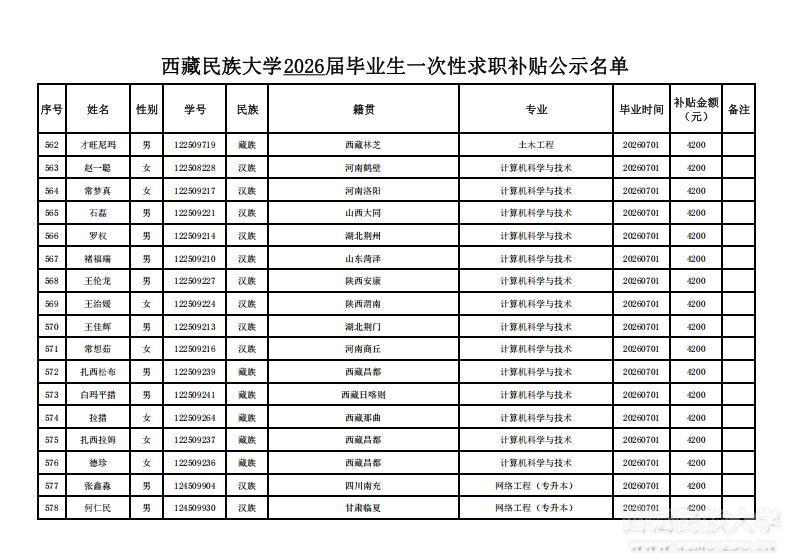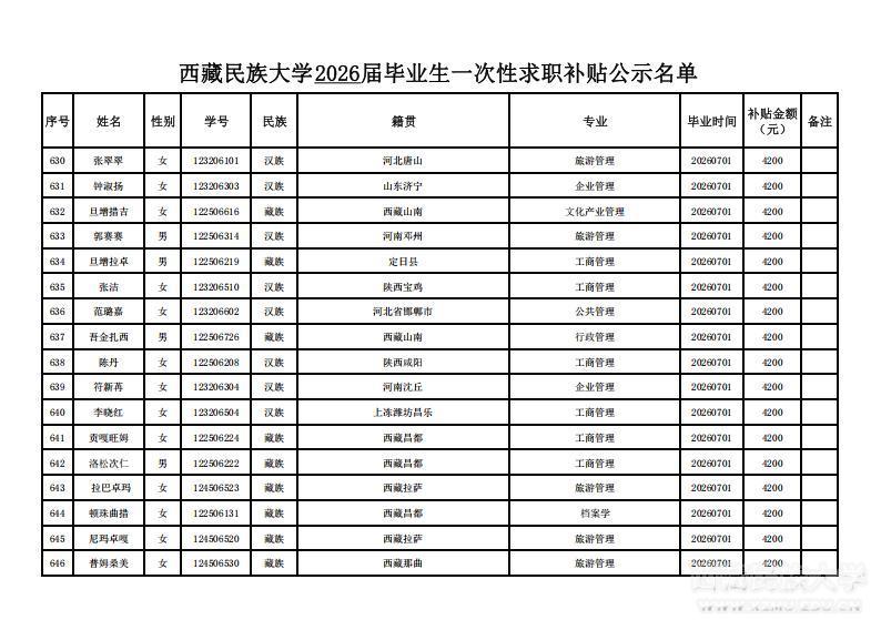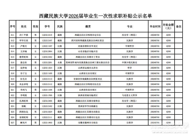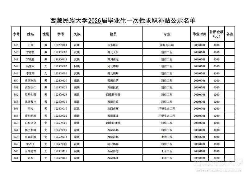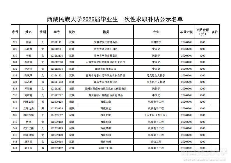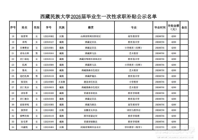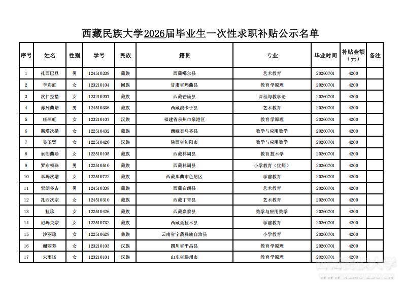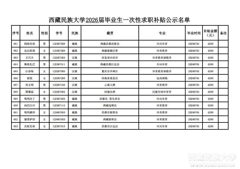 西藏民族大学2026届毕业生一次性求职补贴申领人员公示名单