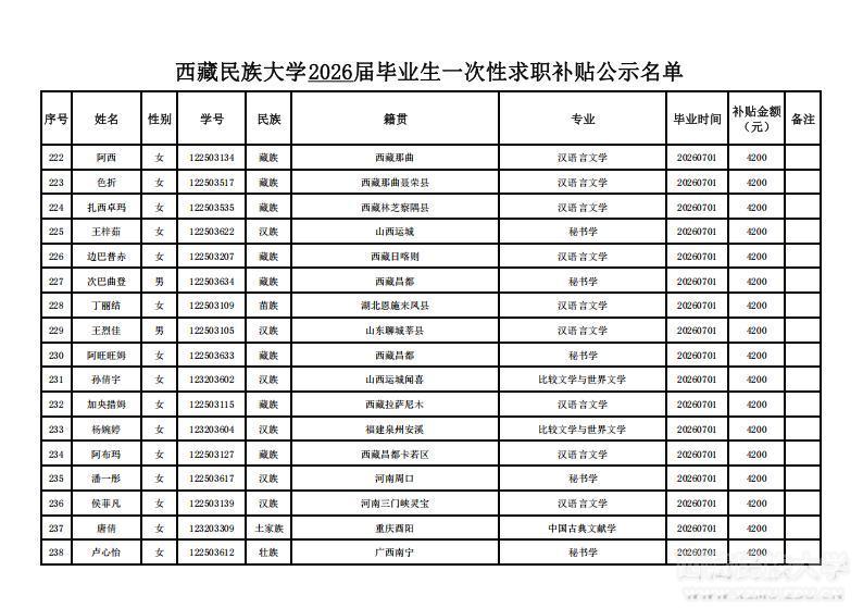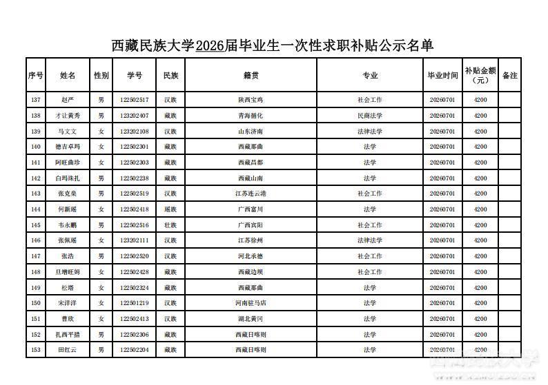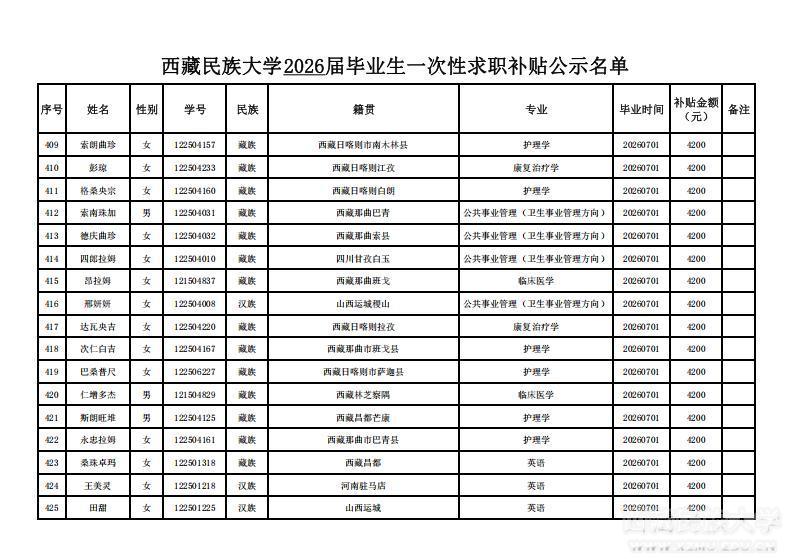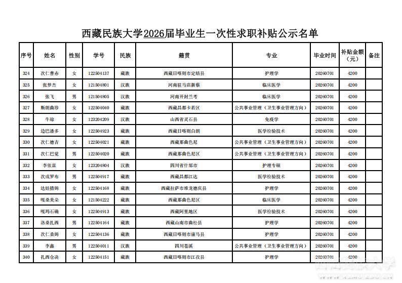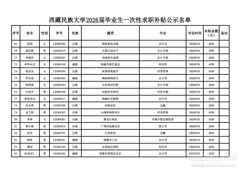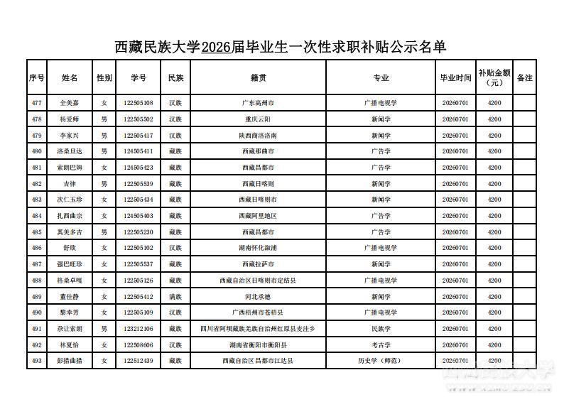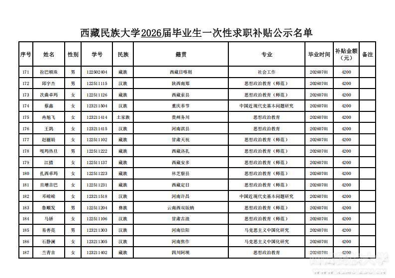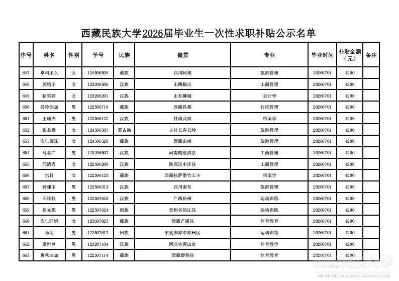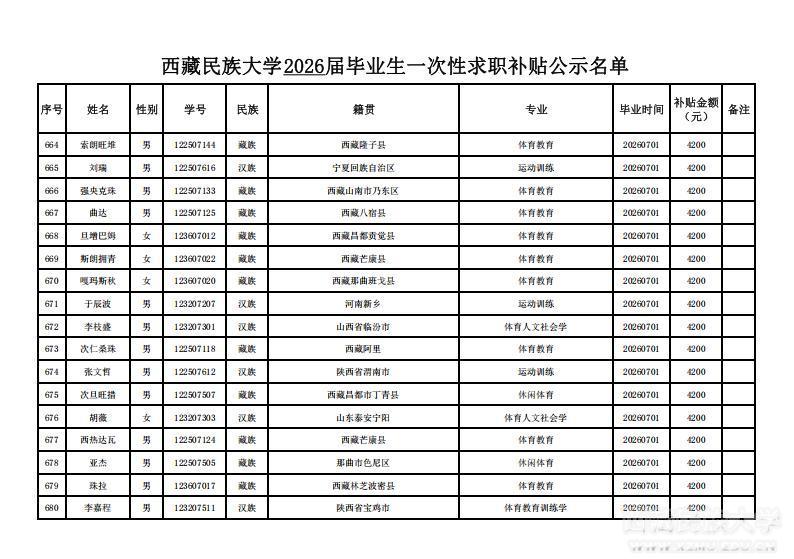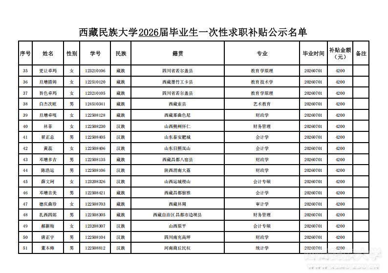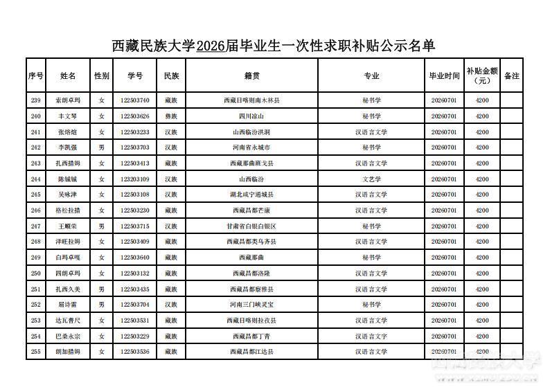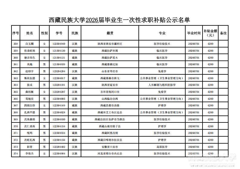 西藏民族大学2026届毕业生一次性求职补贴申领人员公示名单