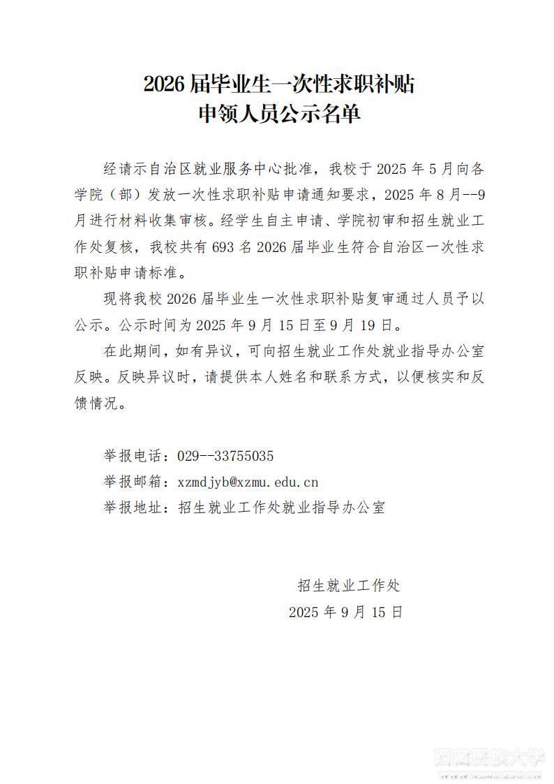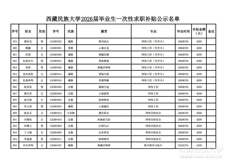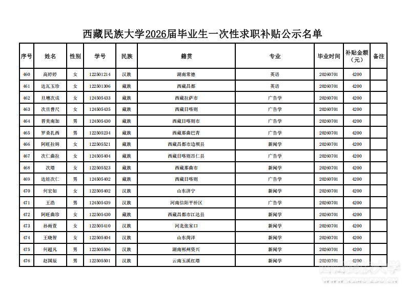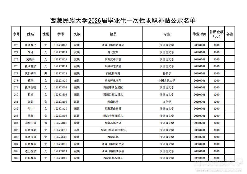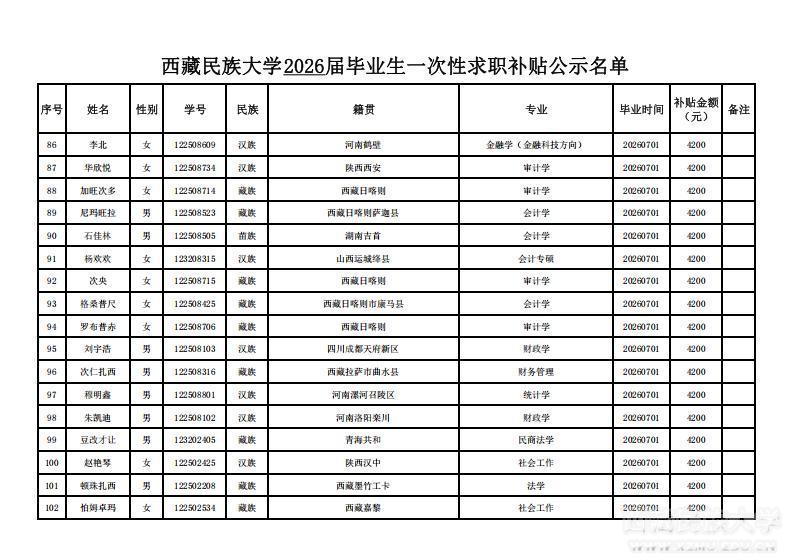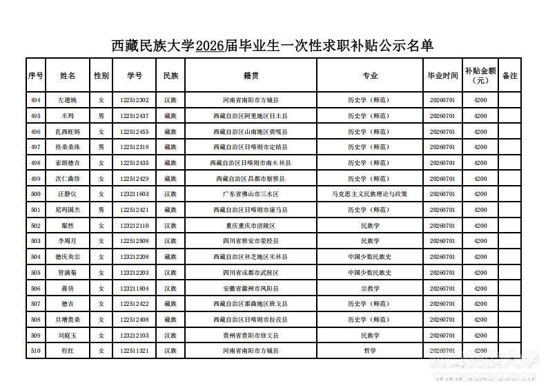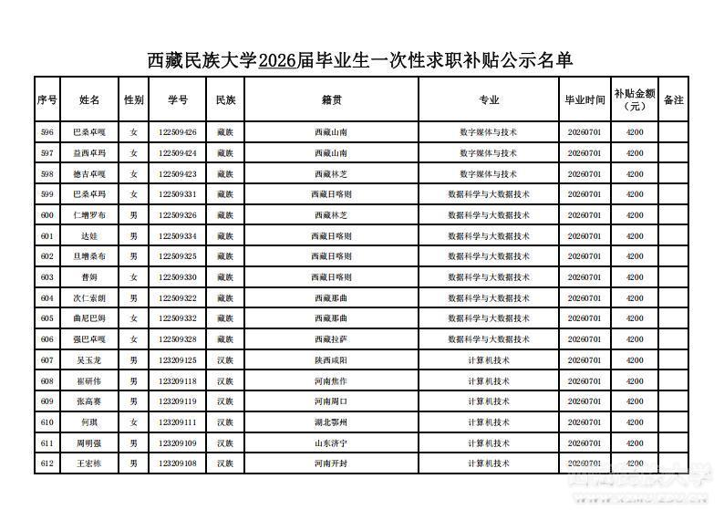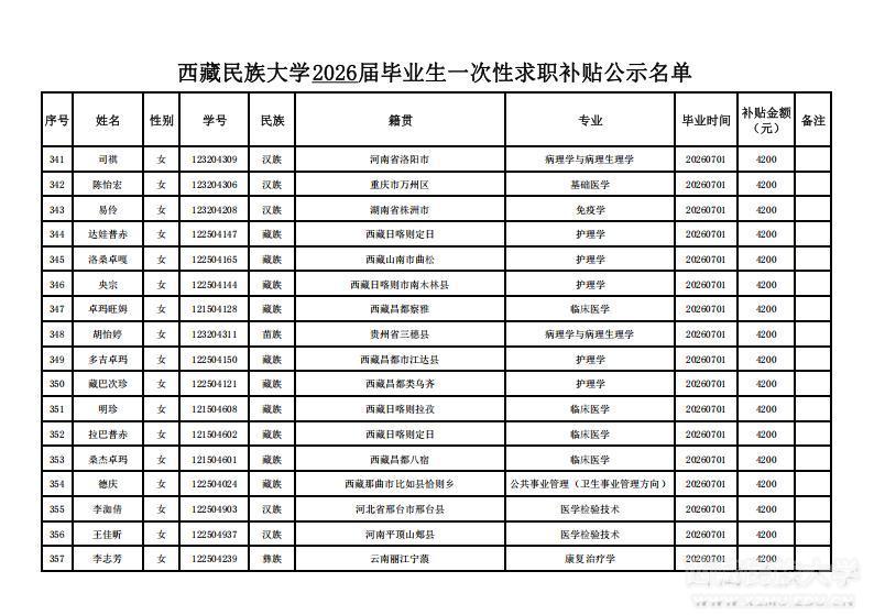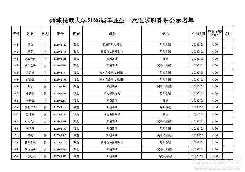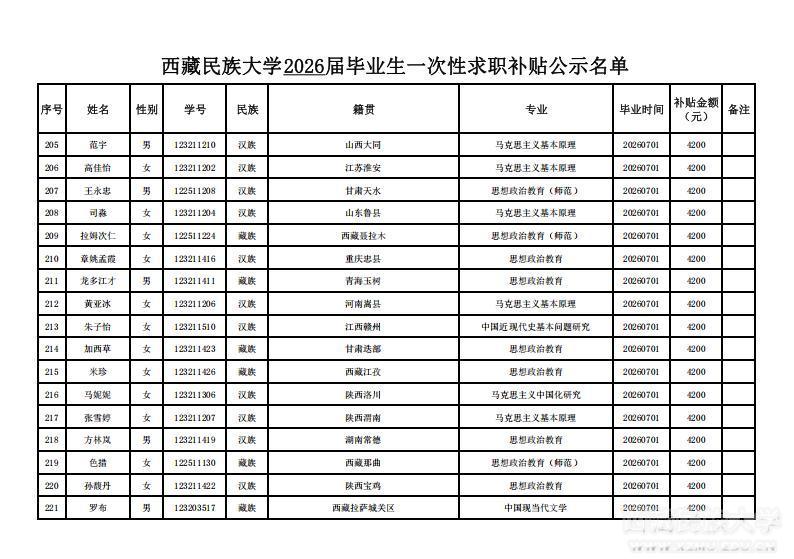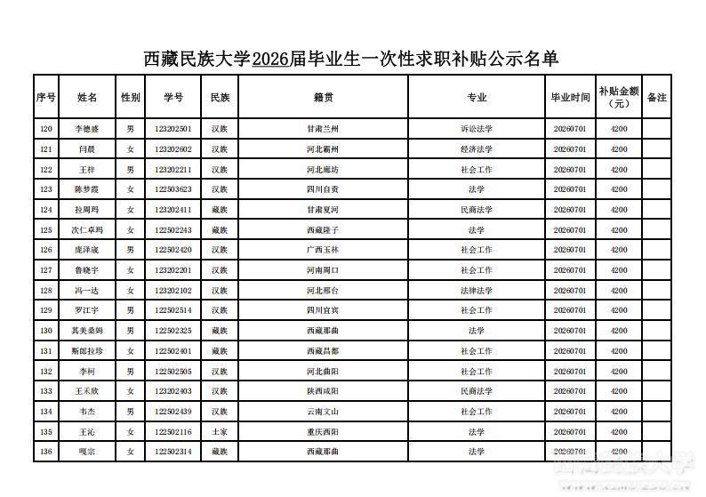 西藏民族大学2026届毕业生一次性求职补贴申领人员公示名单