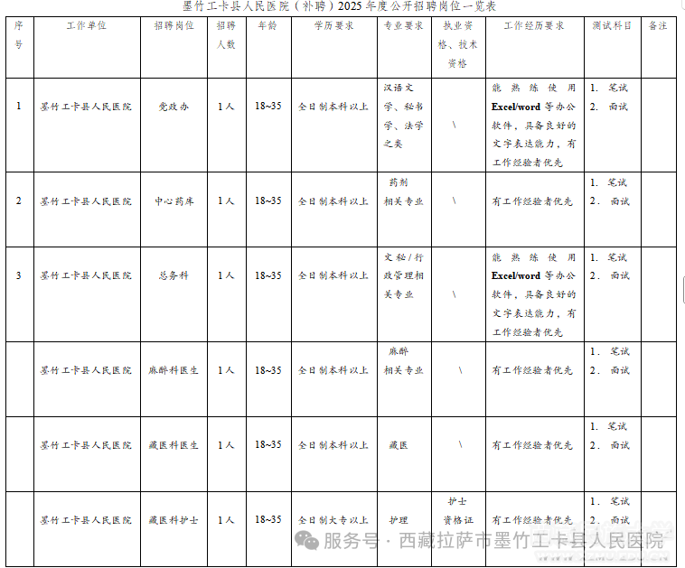 招聘公告 | 墨竹工卡县人民医院(补聘)2025年度公开招聘