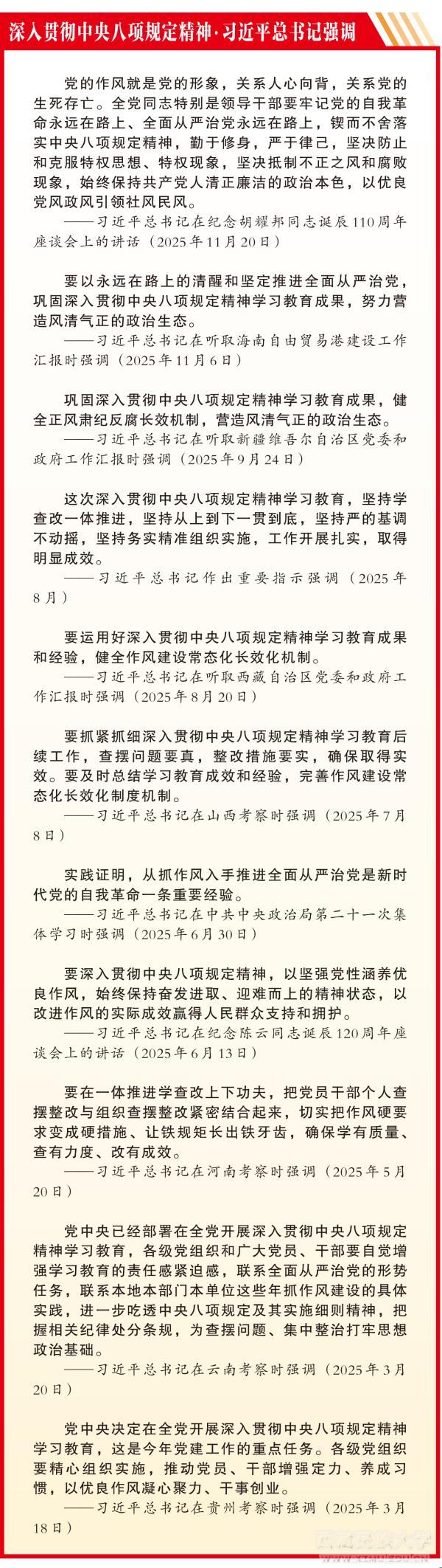 深刻的理论内涵,丰富发展马克思主义政党理论。区别于西方政治谱系下的“选举型政党”,中国共产党是人民的党,是为人民服务的党,将为中国人民谋幸福、为中华民族谋复兴作为自己的初心和使命。初心使命呼唤担当作为,中央八项规定正是担当作为在作风建设领域的具象表现,它将作风建设置于政党建设的重要位置,创新发展了马克思主义关于政党与群众关系的思想。有别于传统意义上的作风治理阶段性、“风暴式”特点,中央八项规定将作风建设嵌入公权力运行的每一个环节,使之成为一种持续性的政治实践和内在的纪律自觉,为破解马克思主义政党“如何永葆革命性”的历史课题提供了中国答案。同时,理论创新的国际传播与实践成效也充分证明,马克思主义政党理论在21世纪仍具有强大生命力,它不仅推动中国共产党在“两个结合”中不断实现自我革新,更为世界马克思主义政党的发展提供了重要启示,这一中国实践必将推动马克思主义政党理论在全世界范围内焕发新的、蓬勃的生机活力。(中央纪委委员、新华通讯社总编辑 吕岩松)