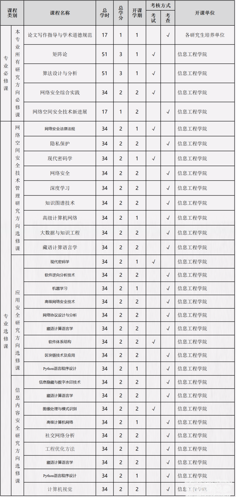 专业选修课分为网络空间安全与管理研究方向选修课、应用系统安全研究方向选修课、网络信息内容安全研究方向选修课,分别开设了9门、9门、8门课程,共计26门课程。每个方向的本学科硕士研究生在该领域至少选修5门专业选修课,计10学分。