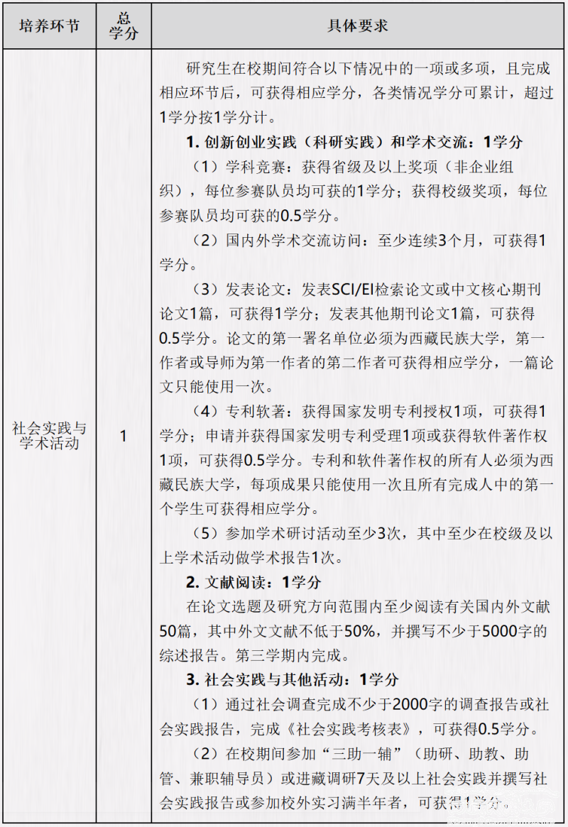社会实践与学术活动:为了提升研究生的综合素养,特设置专业实践与学术活动环节,该环节共需修满1学分。专业实践主要包括科研实践、创新创业实践、社会实践等形式与内容。学术交流是硕士研究生培养工作的重要组成部分,对扩大研究生的知识面,活跃学术思想,培养独立科研能力及掌握国内外本学科相关研究动态有重要意义。研究生在校期间符合以下情况中的一项或多项,且完成相应环节后,可获得相应学分,各类情况学分可累计,超过1学分按1学分计。