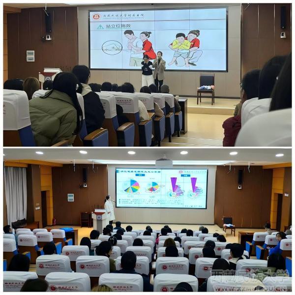 宣讲会分为两个专题环节。王娜护士长以《“海姆立克”急救法》为题,系统讲解了气道异物梗阻的识别方法与急救技术,通过原理阐述与动作示范,生动展示了成人与婴幼儿急救操作的区别与要点,帮助师生掌握在突发状况下实施自救与互救的基本技能,体现了“我们在一起”的互助精神。