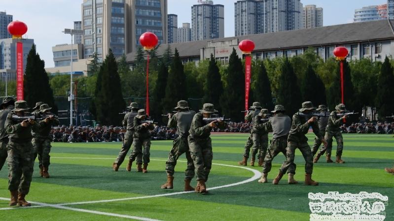 大会在庄严的国歌声中拉开序幕。五星红旗冉冉升起,全体师生肃立行注目礼。随后,2025级新生军训团进行了军事科目汇报表演。各方阵步伐铿锵、气势如虹地依次通过主席台,充分展现了新时代大学生的青春风采与昂扬精神面貌。队列行进、擒敌拳、刺杀操、战术演练、战场救护、文字方阵等科目展示精准有力,赢得了现场观众的阵阵掌声。