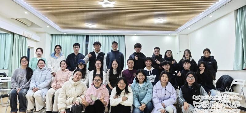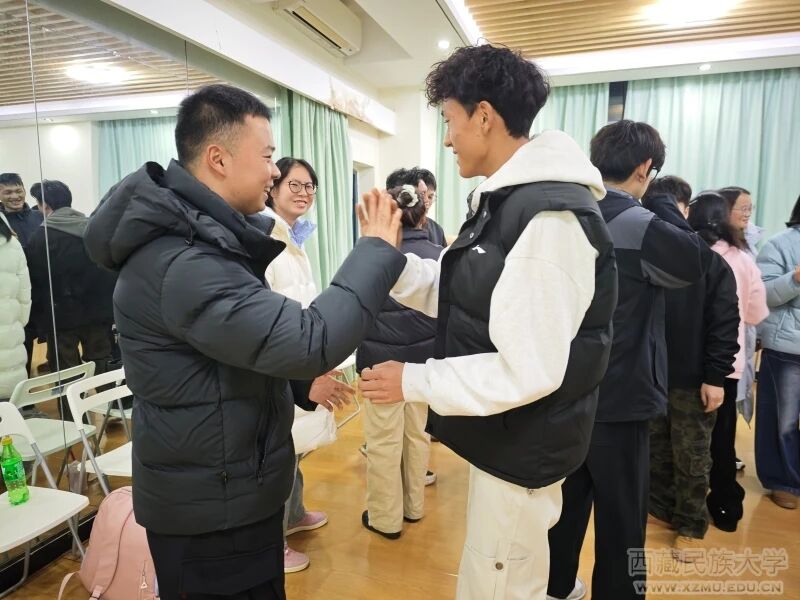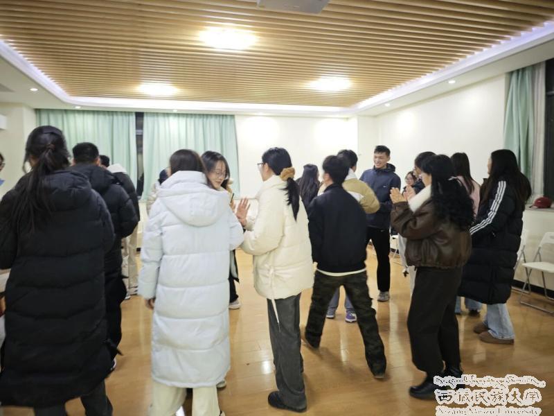 活动在轻松愉悦的音乐中拉开序幕。谢凌飞老师以一段欢快旋律引导同学们逐步放松身心、打破隔阂,建立起安全信任的团体氛围。随后开展的“握手击掌舞”环节中,谢凌飞老师引导参与者围成一个大圆圈,每个同学要与与身边的同学互相握手击掌。在这一环节中,参与者通过与不同的人握手击掌从而拉近彼此之间的关系。