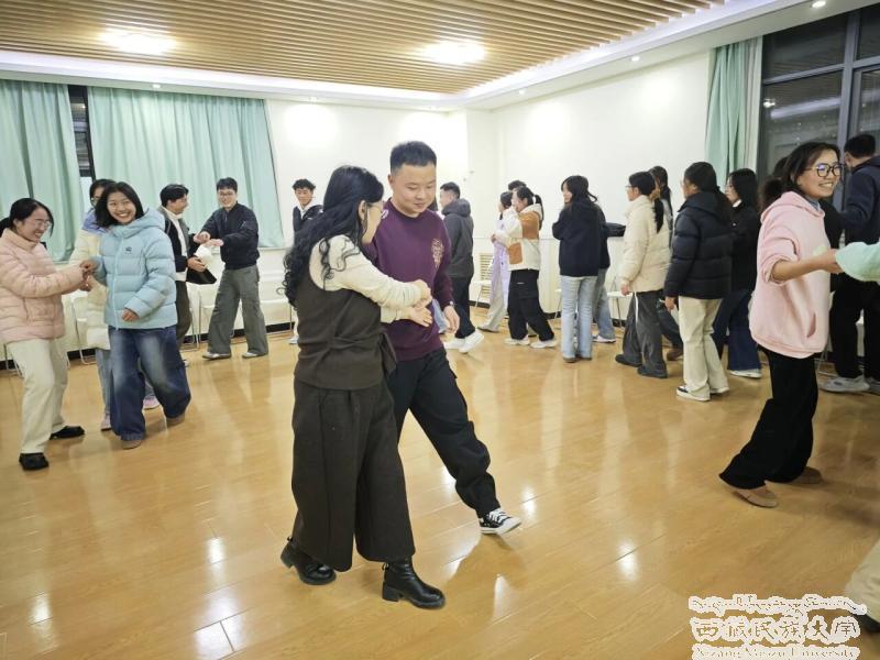 随着优美的波尔卡乐曲响起,全体参与者共同跳起“青春华尔兹”,在旋律与舞步中释放自我、增强联结。活动高潮部分,多名同学主动走向圆心进行个人舞步展示,展现出自信风采与团体支持的力量。