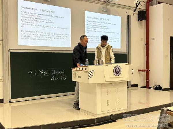 在互动环节,麻争旗教授邀请听讲学生现场为《唐山大地震》《荆棘鸟》《居里夫人》等中外影视作品片段进行汉语、藏语、英语的互译和配音,让同学们切身感受到语言意义建构与声音表现力的双重魅力,加深了大家对影视翻译中对话性、主题性、审美性以及人物形象性的理解,互动现场别开生面,气氛热烈欢快。