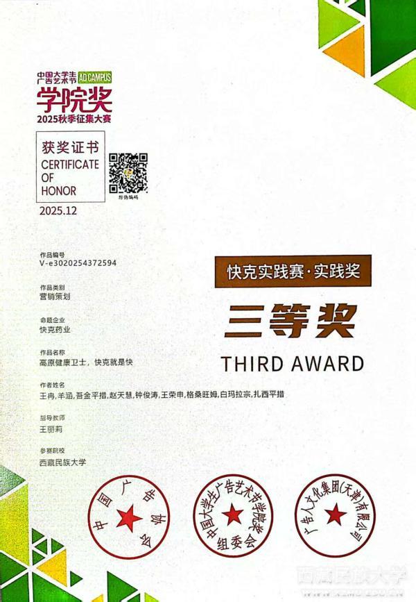2025年,中国大学生广告艺术节学院奖秋季征集大赛启动,快克药业作为命题方,面向全国高校发起营销策划方案征集。全国400多个参赛作品,经大赛专家评委专业评审,新闻与传播学院学生羊涵、王冉、赵天慧、王荣申、格桑旺姆、白玛拉宗、吾金平措、钟俊涛、扎西平措同学创作的《高原健康卫士,快克就是快》作品(指导老师:王丽莉)从海量作品中脱颖而出,获评快克药业命题营销策划类全国赛三等奖作品,与来自全国高校的青年广告人才齐聚交流,展现了西藏民族大学新闻学子的专业素养与创意能力。