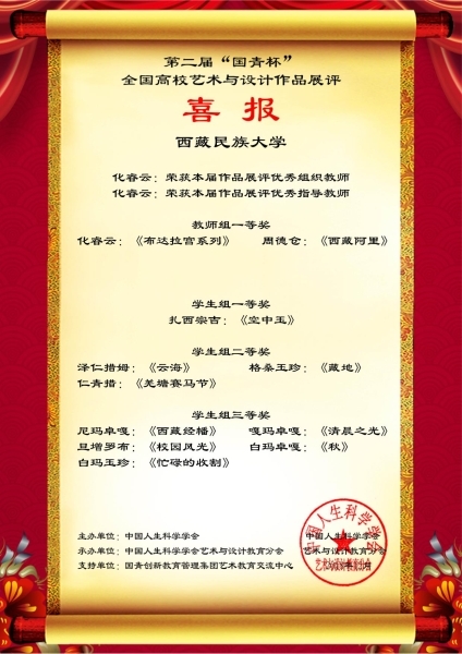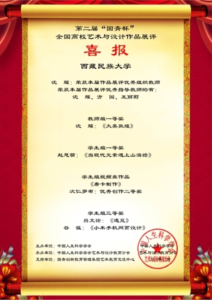 近日,在中国人生科学学会主办、中国人生科学学会艺术与设计教育分会承办的第二届“国青杯”全国高校艺术与设计作品展评大赛中,来自西藏民族大学新闻传播学院周德仓院长的作品《西藏阿里》、化睿云的作品《布达拉宫系列》和沈耀的作品《大美敦煌》获得教师组一等奖;来自2017新闻2班扎西宗吉同学的作品《空中玉》、2018级新闻与传播专业硕士研究生赵思萌同学的作品《当代元素遇上山海经》获得学生组一等奖,另外泽仁措姆等同学的4个作品获得大赛二等奖,吕文论等同学7个作品获得三等奖。新闻传播学院化睿云、王丽莉、方园、沈耀老师被评为“优秀指导教师”,化睿云、沈耀老师获得“优秀组织教师”。